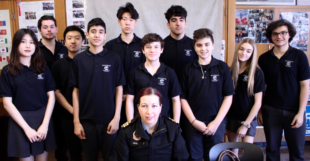 Selena Aral joined the reserves to help pay for post-secondary studies after she graduated high school in 1997. She started off in the navy as a boatswain and remained one for 7 years. She then decided to change tracks and try out logistics; she was accepted in 2004, which allowed her to go back to school to train as a logistics officer and also get her MBA. She qualified in 2008 as a logistics officer for the Royal Canadian Navy. Since then she has been a part of many missions here and abroad, such as Operation Proteus, Operation Nanook, and many others. She is currently working on her Masters in Defence Studies and her MBA, while stationed at the Canadian Forces College in Toronto. In April-May 2019 she and six other officers visited students at Crestwood, sharing their practical experiences in international law and peacekeeping.