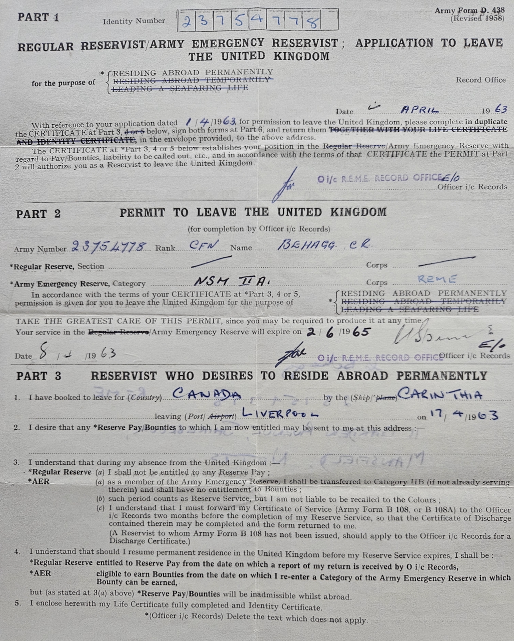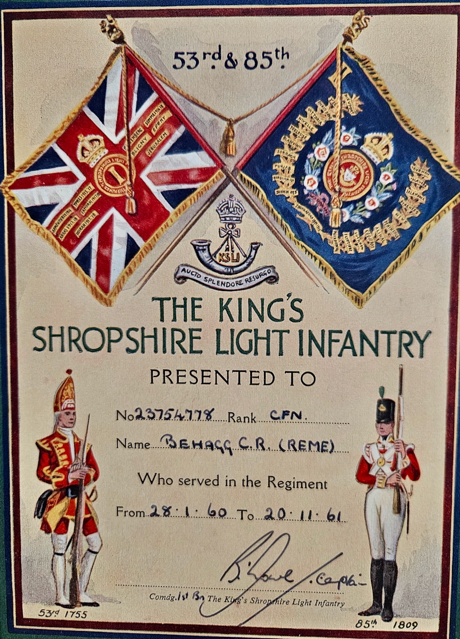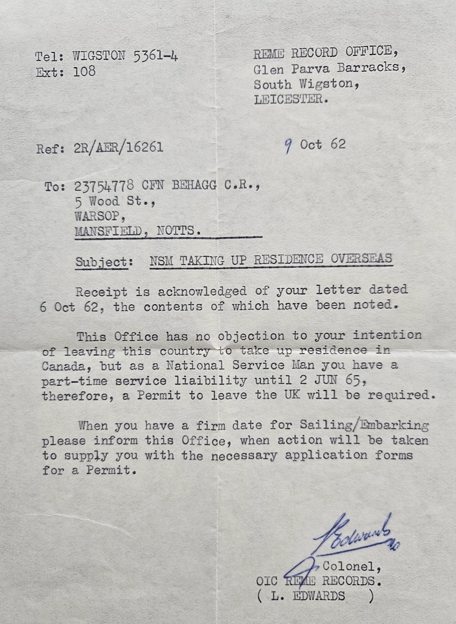 Colin Behagg was born May 2, 1938 in Shirebrook, England, in the county of Derbyshire. He grew up during the wartime years and remembers the rationing and other restrictions of the era; he attended school up to age 16, when he became an apprentice in the auto mechanic trade, and along the way he registered for National Service when he was 18. As he had an apprenticeship, that was deferred until he was 21, and Colin entered the forces in December 1959. After initial training Colin was attached to the King’s Shropshire Light Infantry, and with his mechanical background he was selected for the REME (Royal Electrical and Mechanical Engineers). After a year in England – when he received a special dispensation to get married – he was transferred to Germany, where he was based at Munster. This was the time of the Mau Mau Rebellion in east Africa, so the unit was on alert in case they were needed. When his National Service was complete, Colin returned to the UK, and he and his young wife decided to emigrate, and they decided upon Canada. They sailed to Quebec and made their way to Toronto, where they found an apartment in the city’s west end. Colin found work, and he and his wife moved to Scarborough, where they raised their family. Later Colin relocated to Ajax, and that is where he was interviewed by Scott Masters – at Legion Branch 322 – in August 2025.