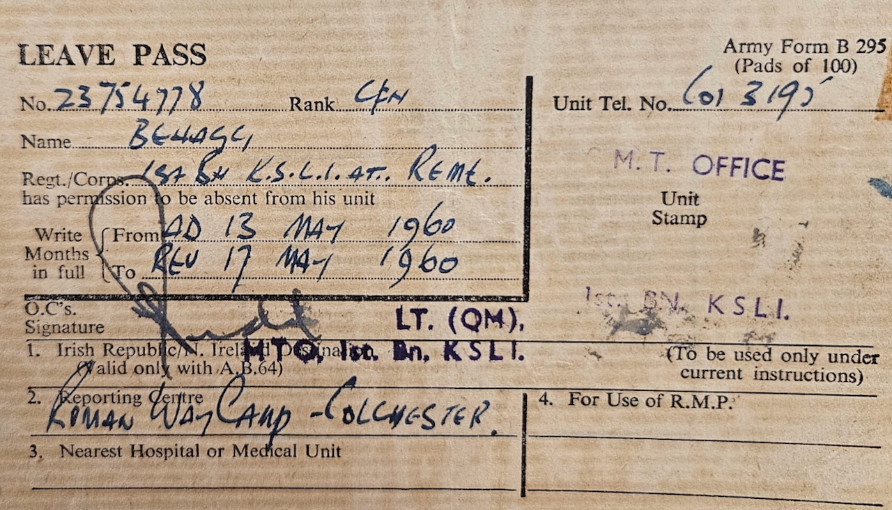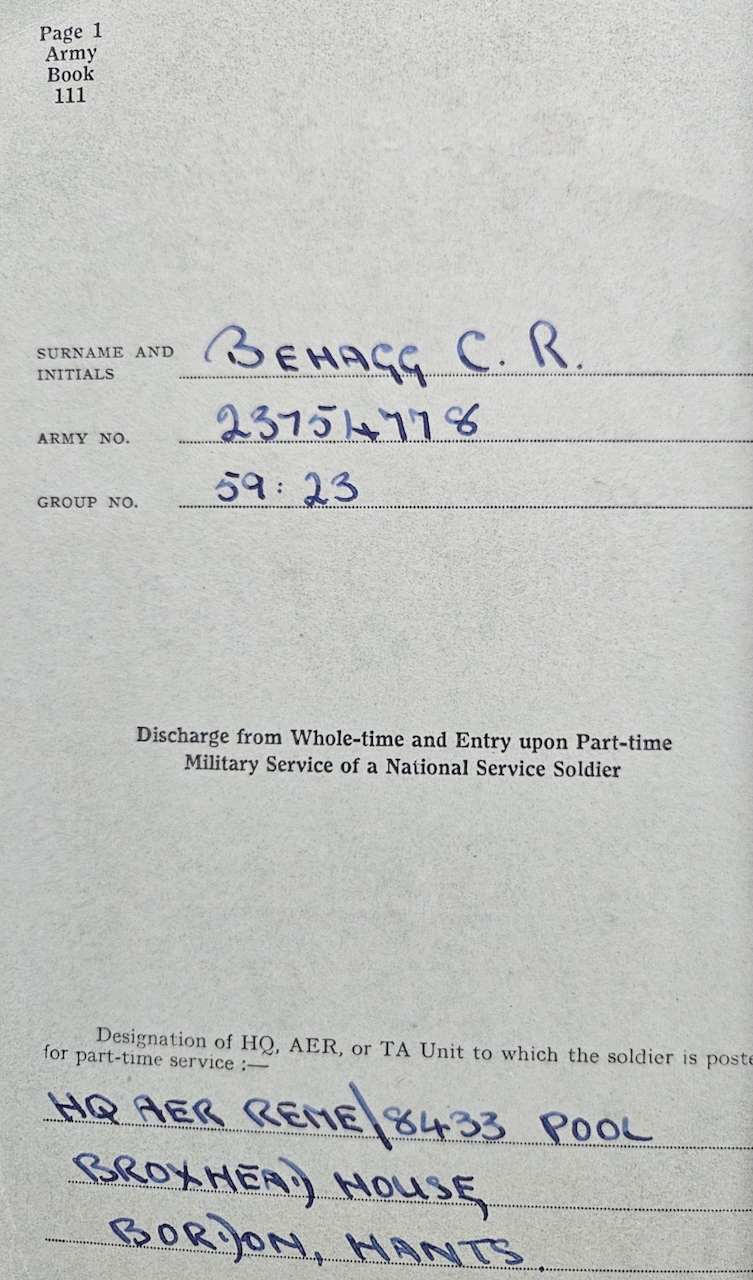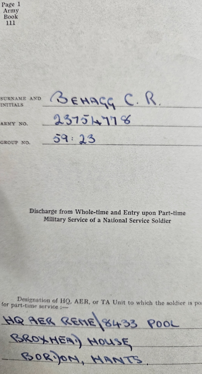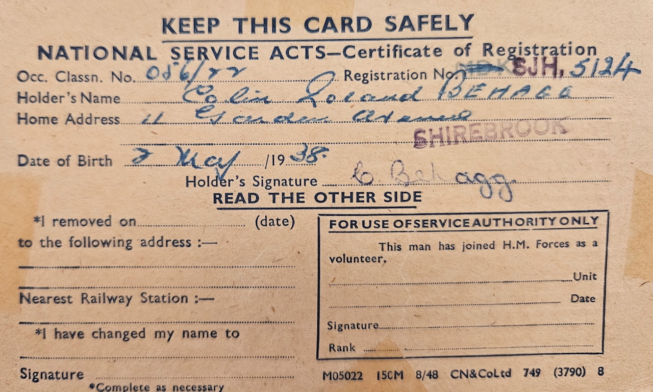 Colin Behagg was born May 2, 1938 in Shirebrook, England, in the county of Derbyshire. He grew up during the wartime years and remembers the rationing and other restrictions of the era; he attended school up to age 16, when he became an apprentice in the auto mechanic trade, and along the way he registered for National Service when he was 18. As he had an apprenticeship, that was deferred until he was 21, and Colin entered the forces in December 1959. After initial training Colin was attached to the King’s Shropshire Light Infantry, and with his mechanical background he was selected for the REME (Royal Electrical and Mechanical Engineers). After a year in England – when he received a special dispensation to get married – he was transferred to Germany, where he was based at Munster. This was the time of the Mau Mau Rebellion in east Africa, so the unit was on alert in case they were needed. When his National Service was complete, Colin returned to the UK, and he and his young wife decided to emigrate, and they decided upon Canada. They sailed to Quebec and made their way to Toronto, where they found an apartment in the city’s west end. Colin found work, and he and his wife moved to Scarborough, where they raised their family. Later Colin relocated to Ajax, and that is where he was interviewed by Scott Masters – at Legion Branch 322 – in August 2025.