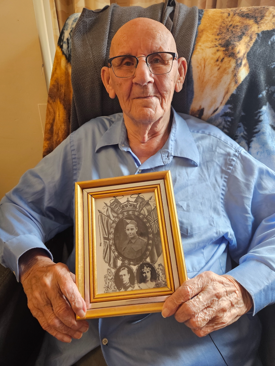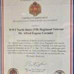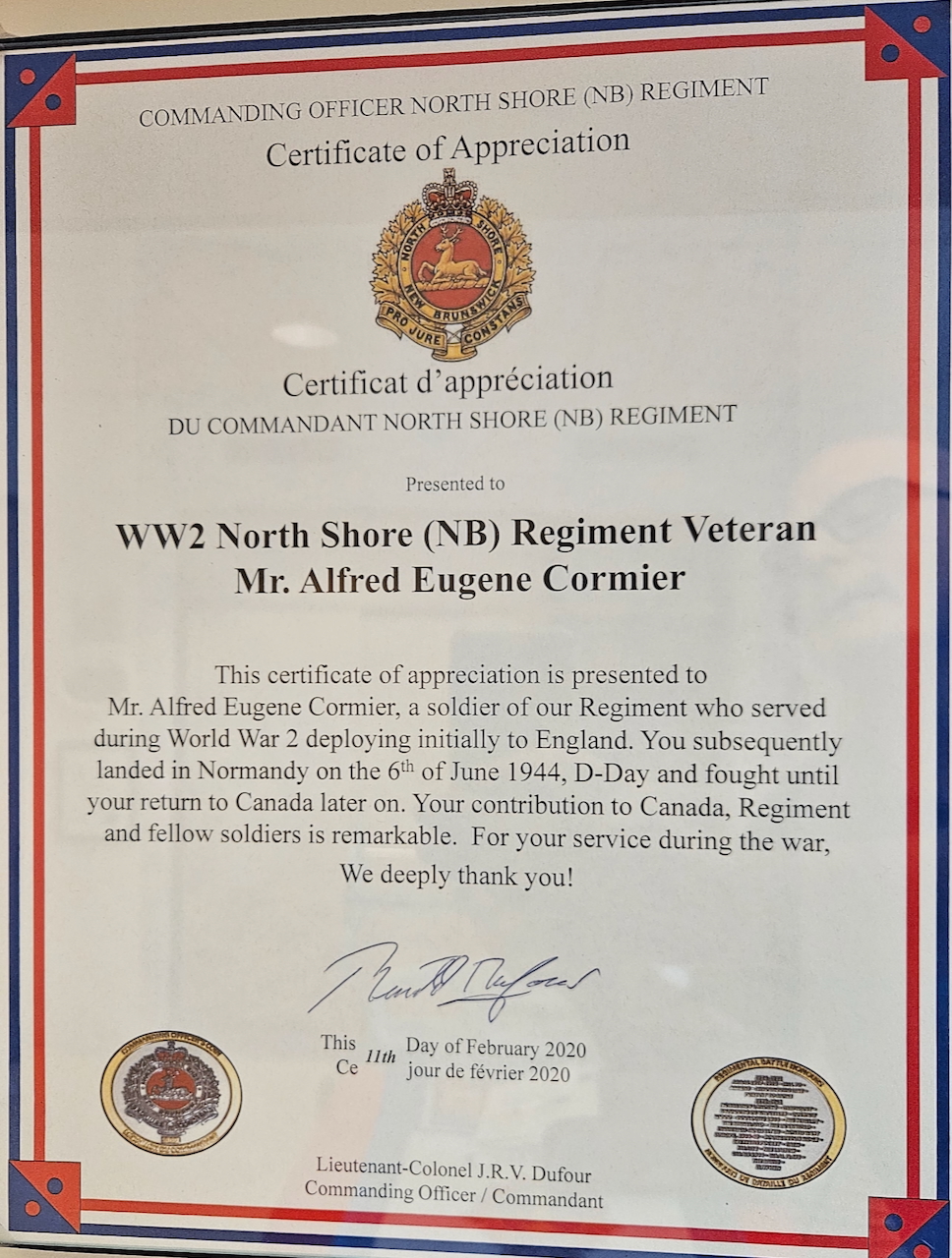 Alfred Cormier was born February 25, 1925 in Boston, Massachusetts. The family had Canadian roots, and when Alfred’s father’s health deteriorated, they moved to New Brunswick when Alfred was 7. Alfred grew up there in the small community of Adamsville. As he recalls he left school when he was 13 – so that he could help support his family during the Depression years. Alfred worked on an uncle’s farm during that time, and when he was 16 he decided to join the Canadian army, lying about his age. He got away with it as his birth certificate was in Boston, and when his parents tried to get him back at home he said he’d run away if they tried to stop him. So he and his friend Maynard went to the recruiting office, where they were served bacon and eggs; given the poverty of the time that made a difference! Alfred made it through the recruitment process and swore his oath to the king as he joined the North Shore New Brunswick Regiment, losing his American citizenship in the process. The next step was to board the troop ship, and Alfred went over in a large convoy full of 3rd Division troops; they arrived in Liverpool and headed to Aldershot, and it was there that their training began. The men knew something was on the way when their training began to intensify in spring 1944, and sure enough it was the long-awaited invasion. Alfred and the North Shore Regiment were slated to hit Juno Beach in the first wave, and they did just that. Alfred made it off the beach and into St-Aubin-sur-Mer, where they spent their first night in France. Sporadic fighting in Normandy continued through the next month as the regiment received its orders to take part in the assault on Carpiquet, where Alfred recalls that they lost more men than on D-day. The advance continued along the coastal route, through Belgium and the Netherlands and into Germany itself. Cheering crowds of civilians greeted the Canadian liberators along that route. Alfred was hospitalized for a time in the Netherlands, but apart from that he was never wounded. When the end of the war came, Alfred opted to stay in the Army of Occupation, and he spent much of the next year in northern Germany. It was then that he returned to Canada: first he was in New Brunswick, where he married, but opportunities were limited, so he and his wife made the decision to move to Montreal, where Alfred found work with Eaton’s. Alfred Cormier was interviewed by Scott Masters at his home in Ste-Anne-de-Bellevue, Quebec in October 2025.