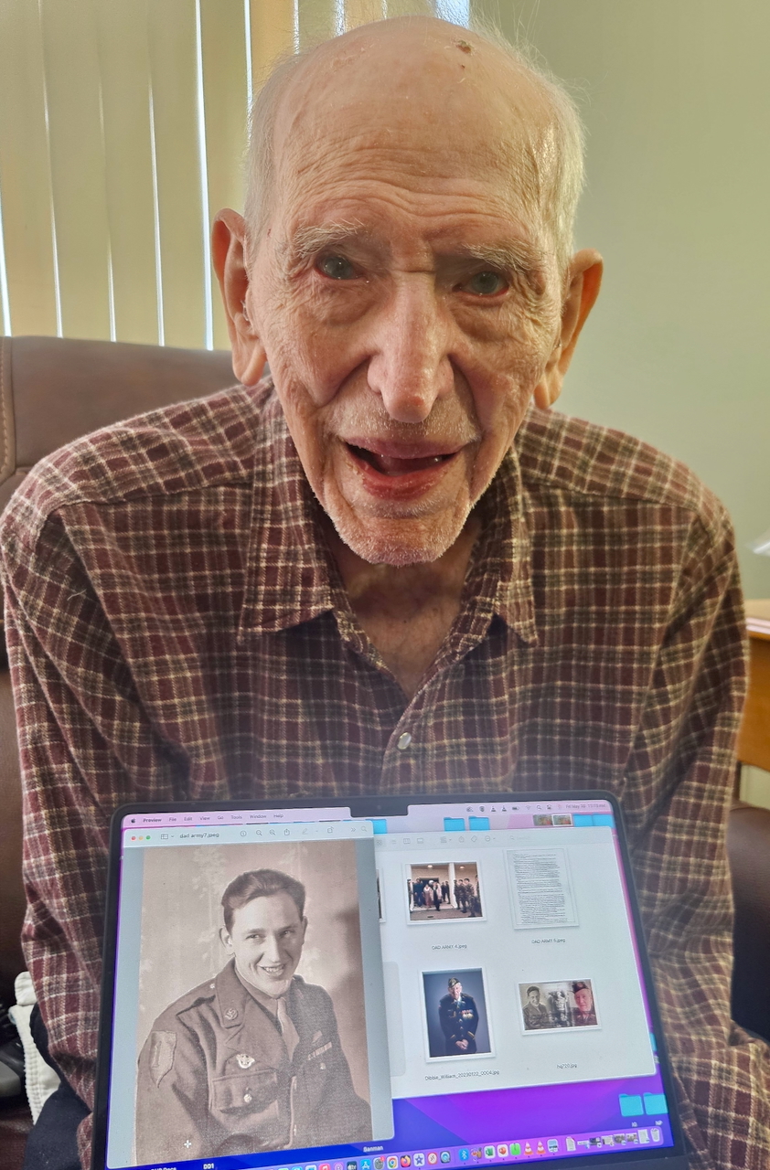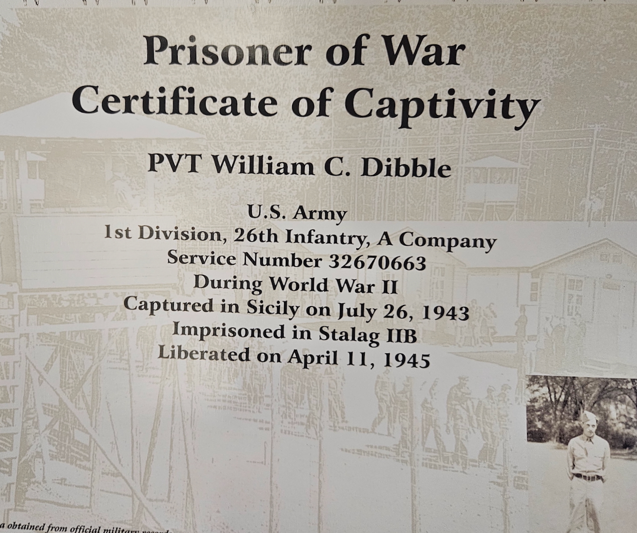 William (Bill) Dibble was born October 7, 1921 in Buffalo, New York. His father was a veteran of the Great War who was wounded several times and who was gassed – it disabled him significantly and he died young. An only child, Bill grew up against the backdrop of the Great Depression and attended Boys’ Vocational High School. Bill had his doubts about Pearl Harbor, but it was the singular event that would impact his generation. Bill received his notice and was inducted into the military, and he went to Fort Bragg for training. Not long after he boarded a troop ship bound for north Africa, and following that campaign he took part in the invasion of Sicily. During that fight Bill was taken prisoner by the Germans, and he ended up being a POW for 31/2 years. He was moved into Germany, and sent to Dulag 2B: for most of his time in custody he was charged with doing agricultural duty, working on a potato farm. Bill remembers the work as being tedious and difficult – and not without its dangers: he once in fact injured his back badly. The conditions were difficult during that long incarceration: hard work, cold, illness and limited food/malnutrition. When the Russians began to close BIll and the rest of the men were forced on the infamous Long March, and they ended up in a prison camp in Germany, where they were liberated by the American 9th Army. During this time one of the German guards took a photograph of Bill and fellow POWs – a unique memento of this difficult time. Soon Bill was in Camp Lucky Strike on the French coast and on his way home. On his return to Buffalo, Bill worked at Chevrolet and the Post Office; he also met Loretta, and the two of them wed in 1950, going on to raise a family and find their way in postwar America. Bill Dibble was interviewed by Scott Masters at his home in Tonawanda, New York in May 2025.