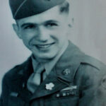 John Foy was born October 12, 1925 in Rochester, New York. He grew up there against the backdrop of the Great Depression, in a large family of ten children where four of the brothers would serve during the war. In the 30s John went to school and did all the normal things for a teenager in the 1930s, which included working as a newspaper boy and projectionist to help support the family. John’s three older brothers were in the service by the time he turned 18, but as John had done well in high school he was accepted into the Army Specialized Training Program, or ASTP, whereby young men of draft age could become part of the enlisted reserves and take coursework in engineering and applied sciences. John had never been far from Rochester, and he chose to attend Cornell University because it was close to home. As it turned out the army needed infantry more than educated officers, and the ASTP was brought to a close: John headed to Fort Dix, and then Fort Benning, where he went through basic training – and had brief dreams of becoming a paratrooper. His division then went to New York for a few days before shipping out on the HMS Queen Elizabeth, sailing solo and crossing the Atlantic in four days to Glasgow, Scotland. They then moved by train to Manchester, England and after a month they continued south, crossing the English Channel to Le Havre on an LCT. John was in the 347th Infantry Regiment of the 87th Infantry Division, and after arrival in France they set across France on their way to Metz, where they saw their first combat. John was in the jeep most of the time in the early days, taking supplies to the front and evacuating the wounded. From Metz the 87th moved north into Belgium and into the heart of the Battle of the Bulge. John’s jeep hit a mine during this time, and he was reassigned as a machine gunner, experiencing intense combat – and freezing winter temperatures – on the front lines. Next they would cross the Rhine River and the Siegfried Line and enter into Germany itself, encountering more bitter fighting. John’s regiment would be among the first Americans to enter Buchenwald and its subcamps, so John at age 19 confronted the full horrors of Nazism, becoming a liberator and a witness. After that they fought their way through Germany, ending near the Czech border. Along the way they took prisoners and watched the war creep towards its inevitable end. When Germany surrendered John and his unit were told they’d be on their way to Japan, so they were moved to LeHavre, France and were ready to ship out. The SS America took them to New York City, and John spent a few more months in the army, keeping himself busy while he awaited his discharge. He returned to Rochester and took a spot in the family plumbing business, also marrying and raising his own family and even joining the naval reserve.