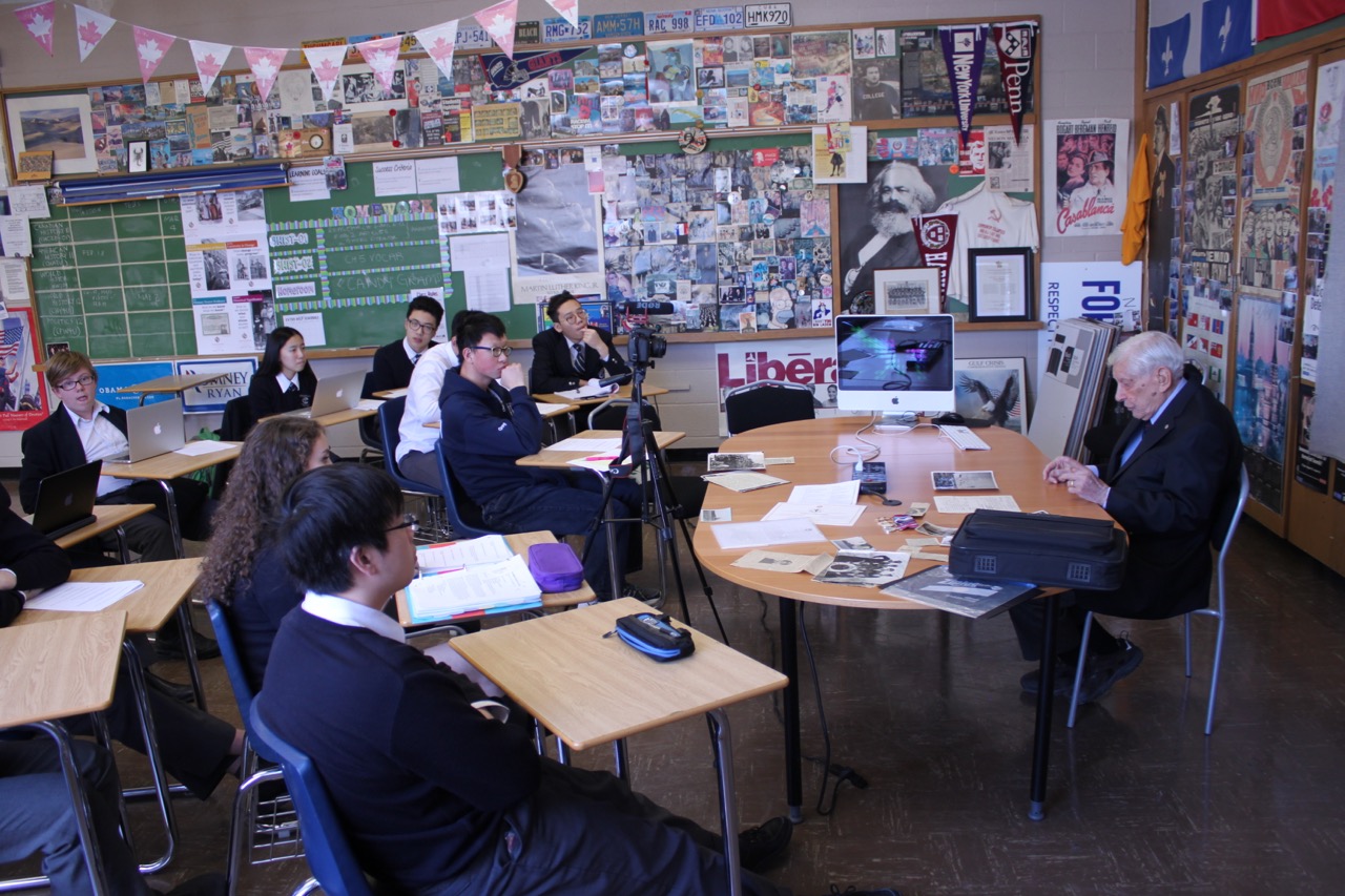 Israel Glassman was born in Montreal, Quebec on April 22nd, 1924, six months after his mother landed in Canada. He was not born in a very good period: the Great Depression hit Canada in 1929 and 1930. During that time, Mr. Glassman played street hockey and baseball with his friends for fun. He also did many other things for entertainment, for example watching movies. The problem of unemployment was very serious in those years, but Mr Glassman was a lucky boy as he could find job like selling newspapers, which enabled him to give some of his earnings to his mother. When the war came, he went to join the Navy. His uncle and mother were very respectful of his choice. They said: “Canada needs you, you go.” Mr. Glassman and his comrades did a lot for Canada during the war years, escorting trans-Atlantic convoys and helping with D-Day operations. His story is full of emotion, especially as he recalled good friends and the tough visions that remain with him, and the details helped the students to visualize life in early 20th century Canada.