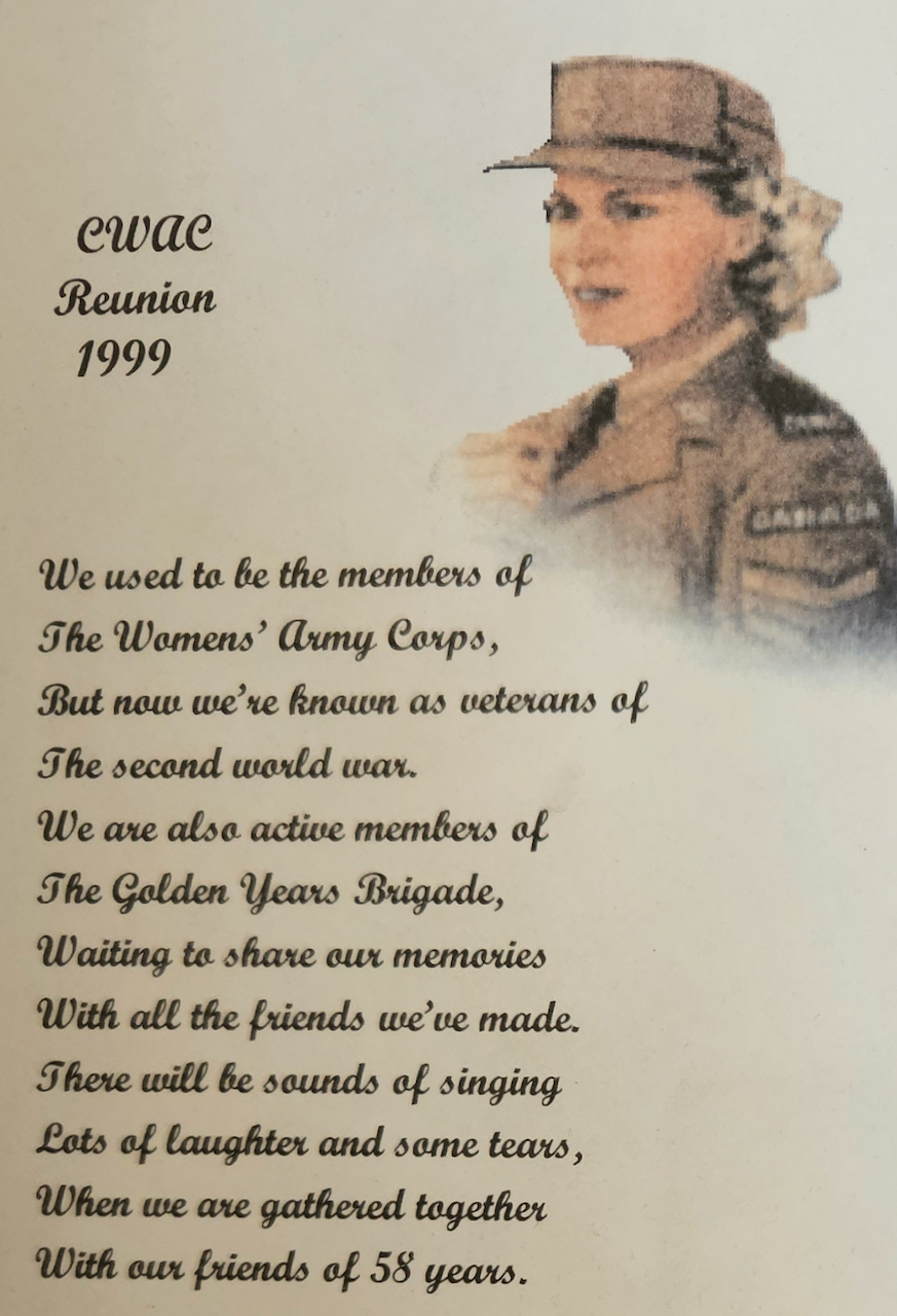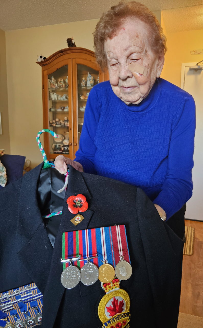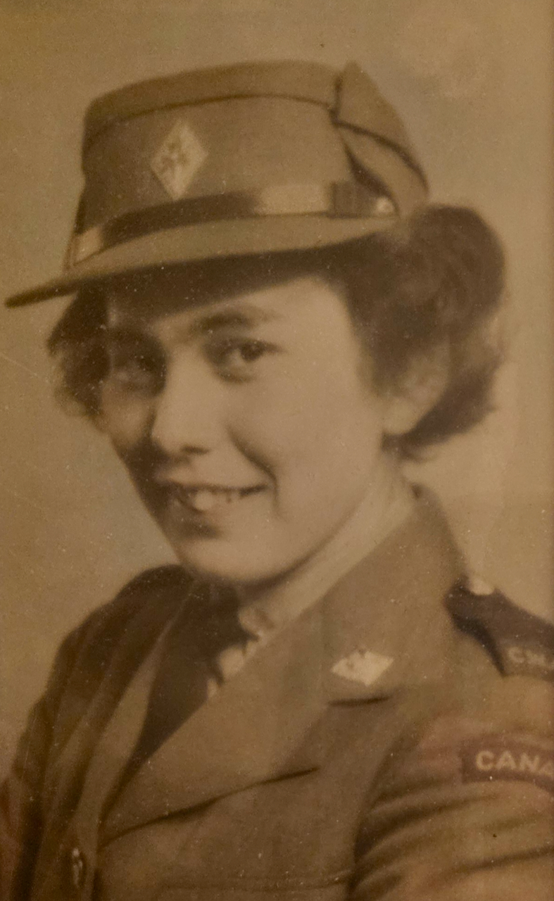 Una Golding (nee Sinclair) was born September 27, 1926 in Fairford, Manitoba. She grew up in that small farming community, where she was raised by her mother and grandfather. Una recalls going to a one room schoolhouse in her small town; to go to high school she would have had to go to Winnipeg, which she did not want to do, instead electing to work on a nearby farm. Food was always around on the farm, and Una does not recall the Great Depression as having too much of an impact on her in those years. She does recall learning about the war as she worked on that farm from 1942-44, and seeing the flying schools that began to dot the Prairies countryside. When Una turned 18 she joined up right away, going into the Canadian Women’s Army Corps (CWACs). She reported for training and after a short period in Kitchener and Ottawa she was sent to Quebec City, where she worked as part of the Royal Canadian Ordnance Corps, sorting uniforms and doing office work. She was there when VE Day was announced, and Una like many others volunteered to do her part in the ongoing war against Japan, but the atomic bombs obviated that possibility. She met a young man named Alan during this time, and the two of them struck up a romance and married. Alan chose to stay in the military and together the two of them began an odyssey across Canada as they were posted on a variety of bases. They also did an overseas stint in West Germany during the difficult years of the Cold War. Una and Alan raised their family and Una remained active in the community, heavily involved in the Legion and volunteering for a host of organizations, all the while promoting a strong civic spirit and an ideal of remembrance. Una Golding was interviewed by Scott Masters at her home in Peterborough in February 2025.