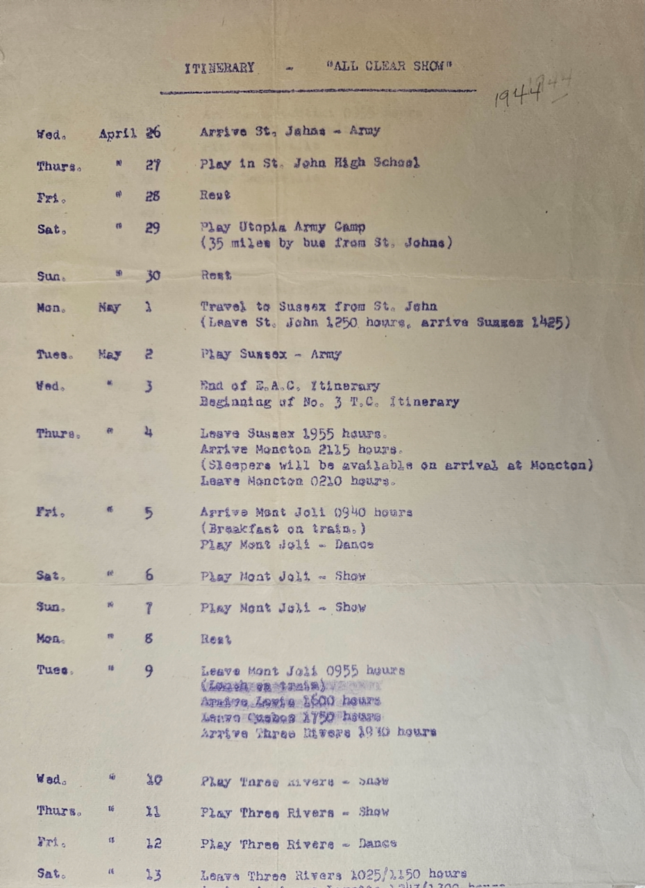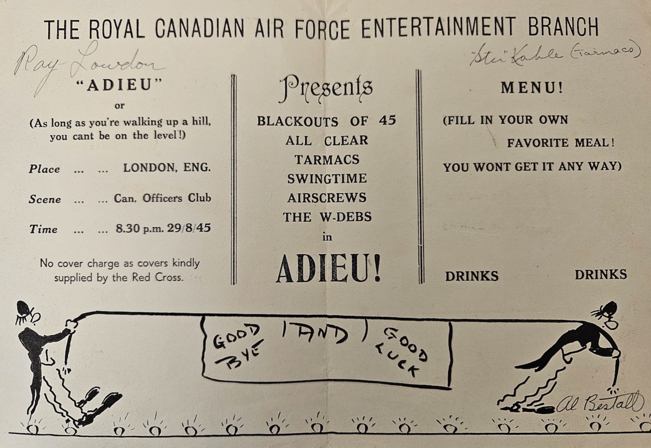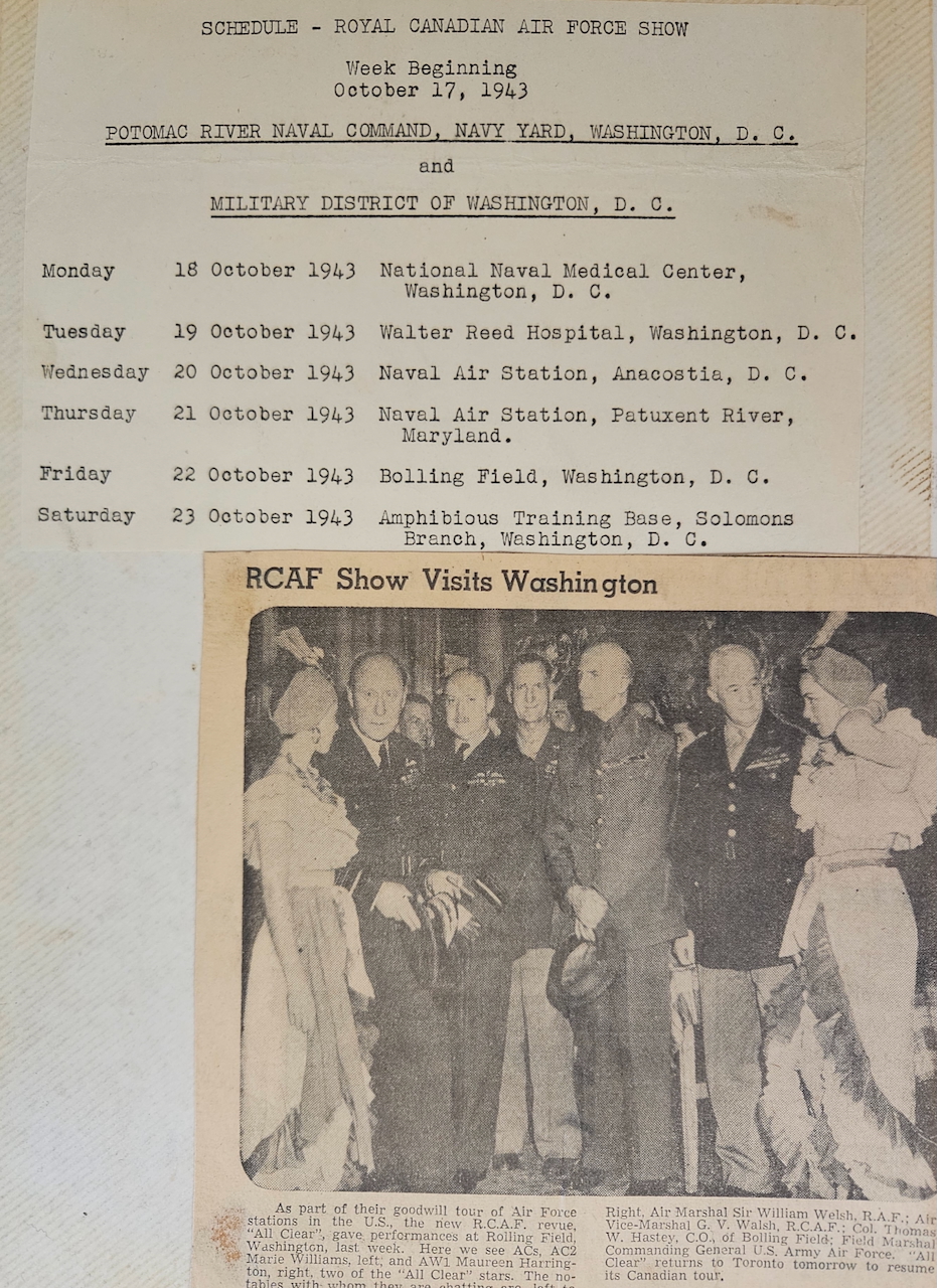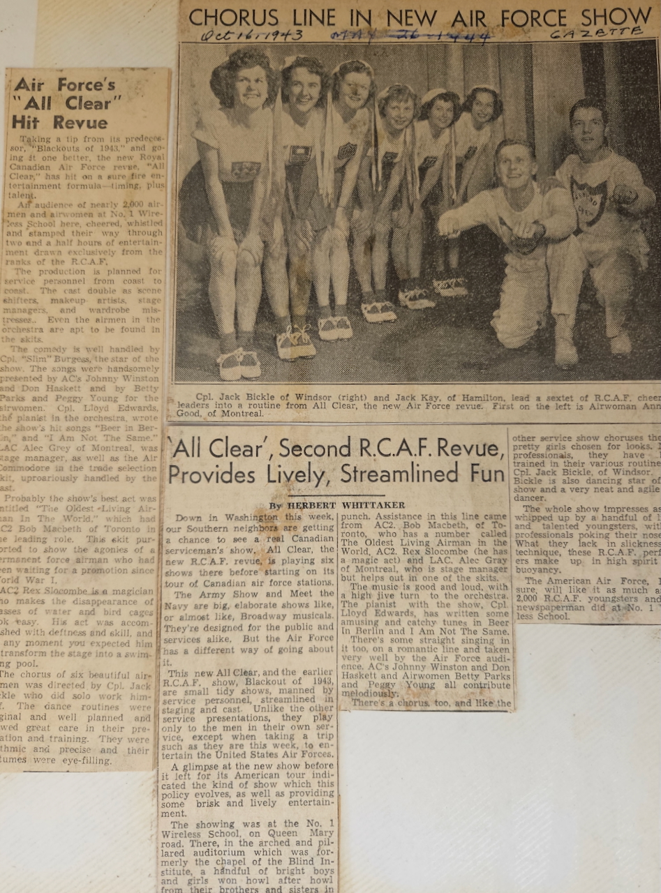 Annie Good was born November 4, 1921 in Verdun, Quebec. She was active as a dancer in her teens and consequently left school early; she went to work for Northern Electric Company in the early years of the war, where she did her part in war industry. While she enjoyed the work she did not want to continue that, instead preferring to play a more direct role in the war effort. As she saw so many young men go off to war she decided to do the same, joining the RCAF. She went through basic training but as she had “dancer” on her resume, she was recruited as an entertainer. She worked on a touring show called “All Clear”; they played locations in Canada to begin, often in conjunction with Victory Bond drives. Later they travelled to parts of the U.S. and even went overseas to Europe, entertaining the Canadian troops and airmen who were awaiting their return to Canada. Annie had two brothers overseas, and she was able to see them both during this time – it made her feel like she was “doing her bit”. She made her way back to Canada in 1947, and not long after she met Howard McNamara: they married and raised a family, finding their way in the rhythms of postwar Canadian life. Annie McNamara (nee Good) was interviewed by Scott Masters at her home in Ste-Anne-de-Bellevue, Quebec in October 2025.