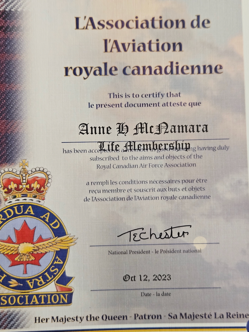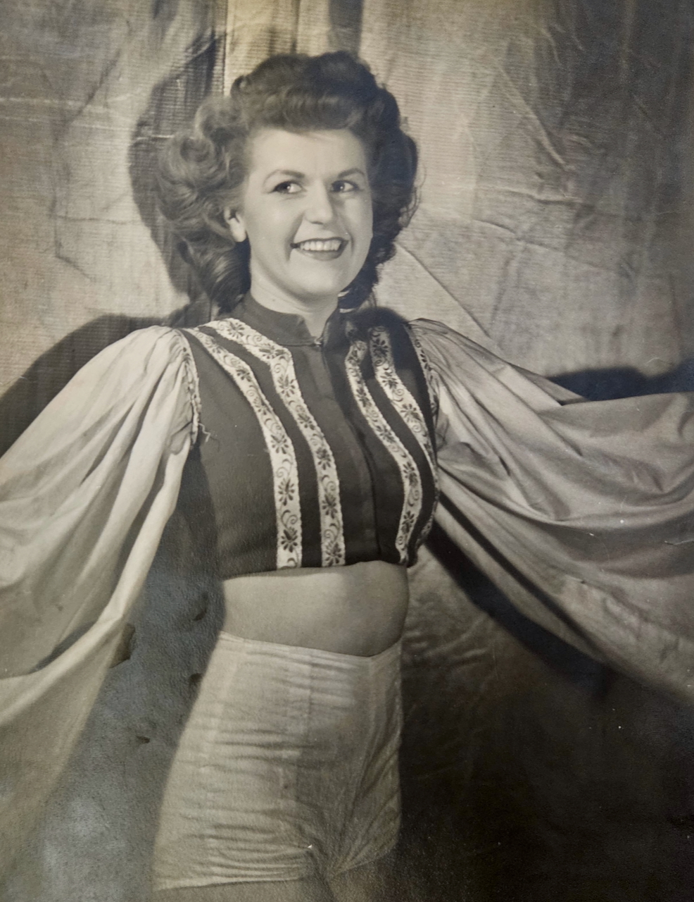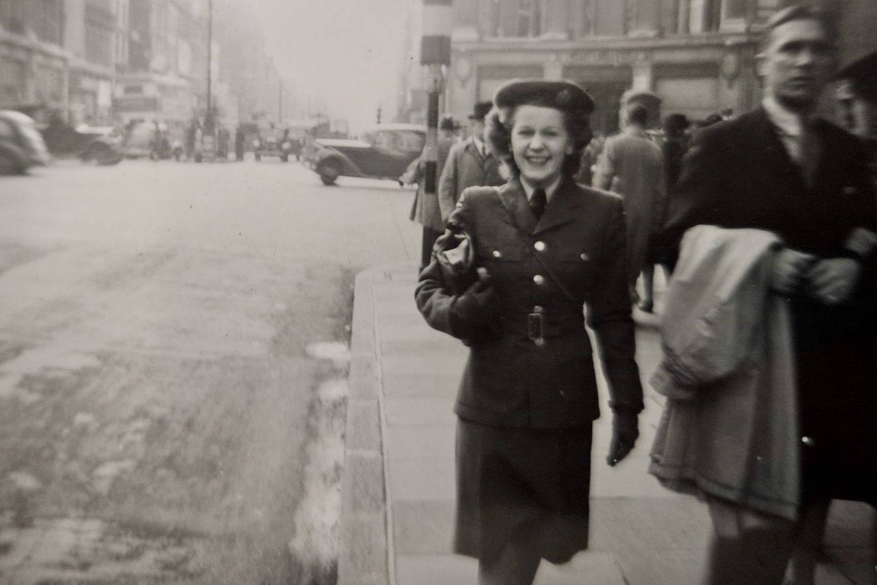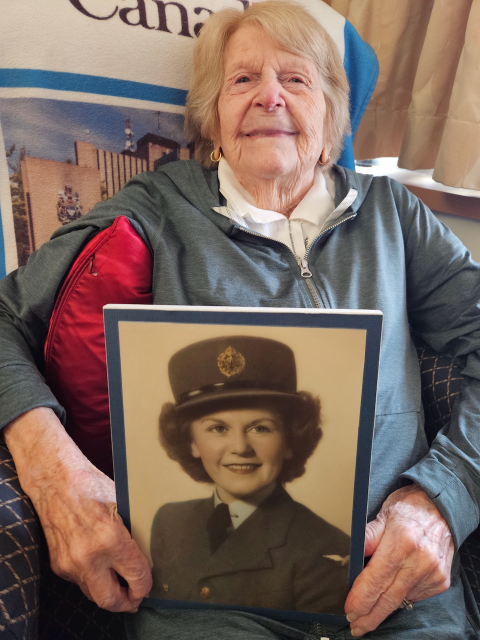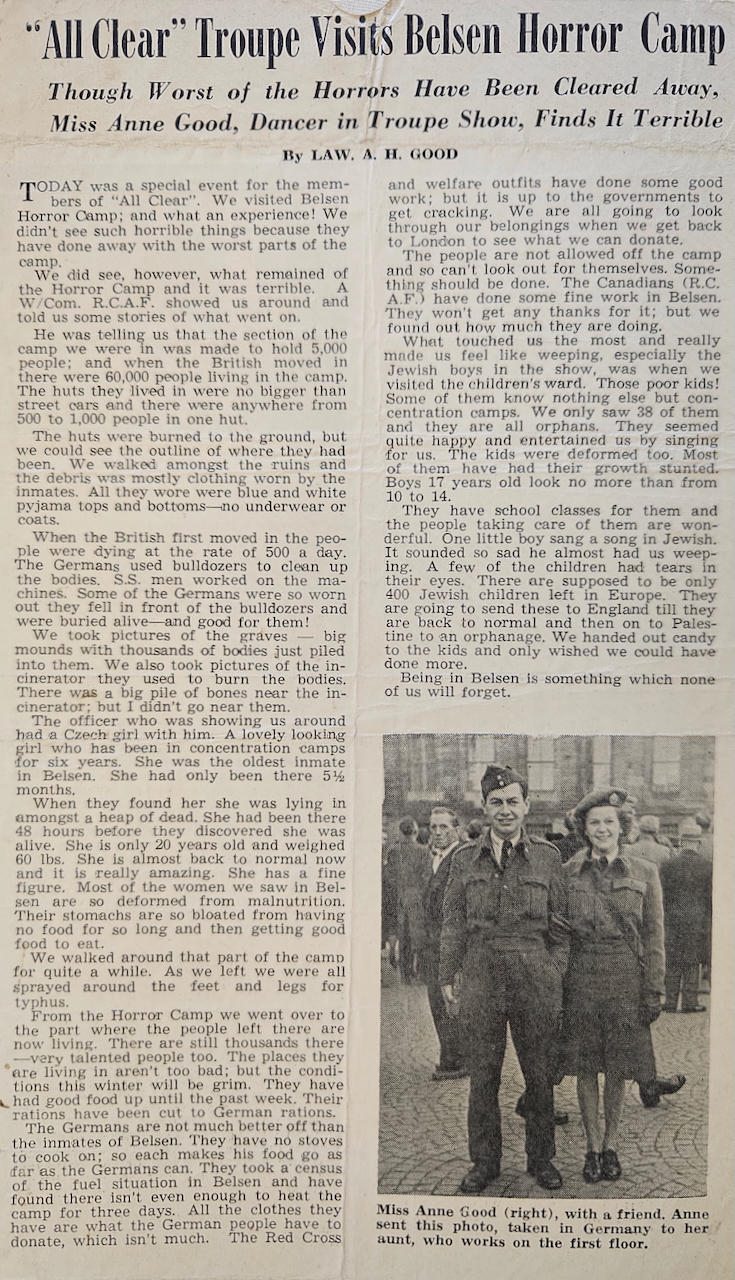 Annie Good was born November 4, 1921 in Verdun, Quebec. She was active as a dancer in her teens and consequently left school early; she went to work for Northern Electric Company in the early years of the war, where she did her part in war industry. While she enjoyed the work she did not want to continue that, instead preferring to play a more direct role in the war effort. As she saw so many young men go off to war she decided to do the same, joining the RCAF. She went through basic training but as she had “dancer” on her resume, she was recruited as an entertainer. She worked on a touring show called “All Clear”; they played locations in Canada to begin, often in conjunction with Victory Bond drives. Later they travelled to parts of the U.S. and even went overseas to Europe, entertaining the Canadian troops and airmen who were awaiting their return to Canada. Annie had two brothers overseas, and she was able to see them both during this time – it made her feel like she was “doing her bit”. She made her way back to Canada in 1947, and not long after she met Howard McNamara: they married and raised a family, finding their way in the rhythms of postwar Canadian life. Annie McNamara (nee Good) was interviewed by Scott Masters at her home in Ste-Anne-de-Bellevue, Quebec in October 2025.