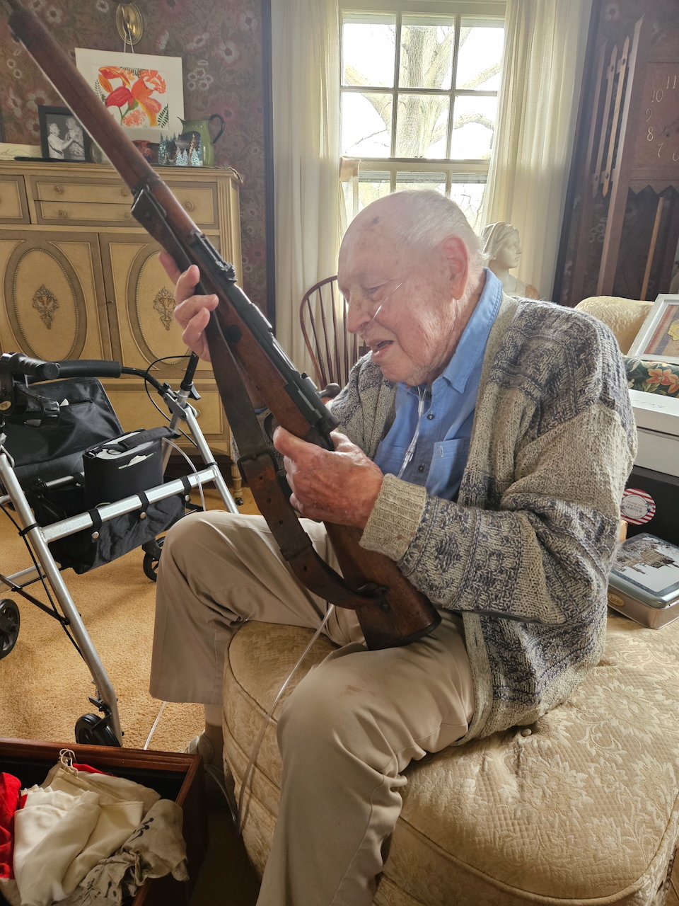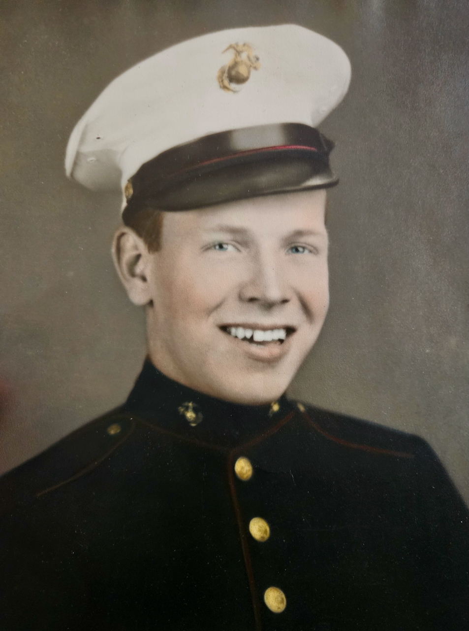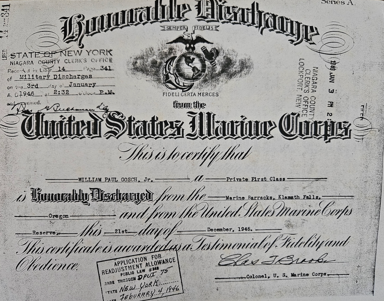 Bill Gosch was born December 8, 1923 in North Tonawanda, New York. He grew up in that community outside Buffalo during the Great Depression, attending school and doing all the normal childhood activities of the time. The attack on Pearl Harbor took place when Bill was in high school, and it would of course impact the fates of Bill’s generation. Bill elected to join the Marines, and in short order he was off to Parris Island and San Diego for training, and then off to the south Pacific. He began in Guadalcanal, and then moved on to Bouganville, where he dealt with the miserable jungle conditions though not yet combat. As a replacement Marine, Bill was selected to be in Carlson’s Raiders, and he would go on to Guam and Okinawa with them, and that is where Bill’s baptism under fire would take place. Bill carried a Browning Automatic Rifle during that time, and as such he was a key part of the fire team, engaging the Japanese on a number of occasions and overcoming fanatical resistance in what proved to be the final days of the war’s last battle. When it was over, Bill returned to Guadalcanal, and then San Francisco and Klamath Falls, and his military career was at an end. He returned to North Tonawanda – where he used his GI Bill benefits and a football scholarship to go to college, where he completed a degree in philosophy. He married soon after that, going on to raise a family and build a career – all while he found his way in postwar America. Bill Gosch was interviewed by Scott Masters at his home in North Tonawanda, New York in April 2025.