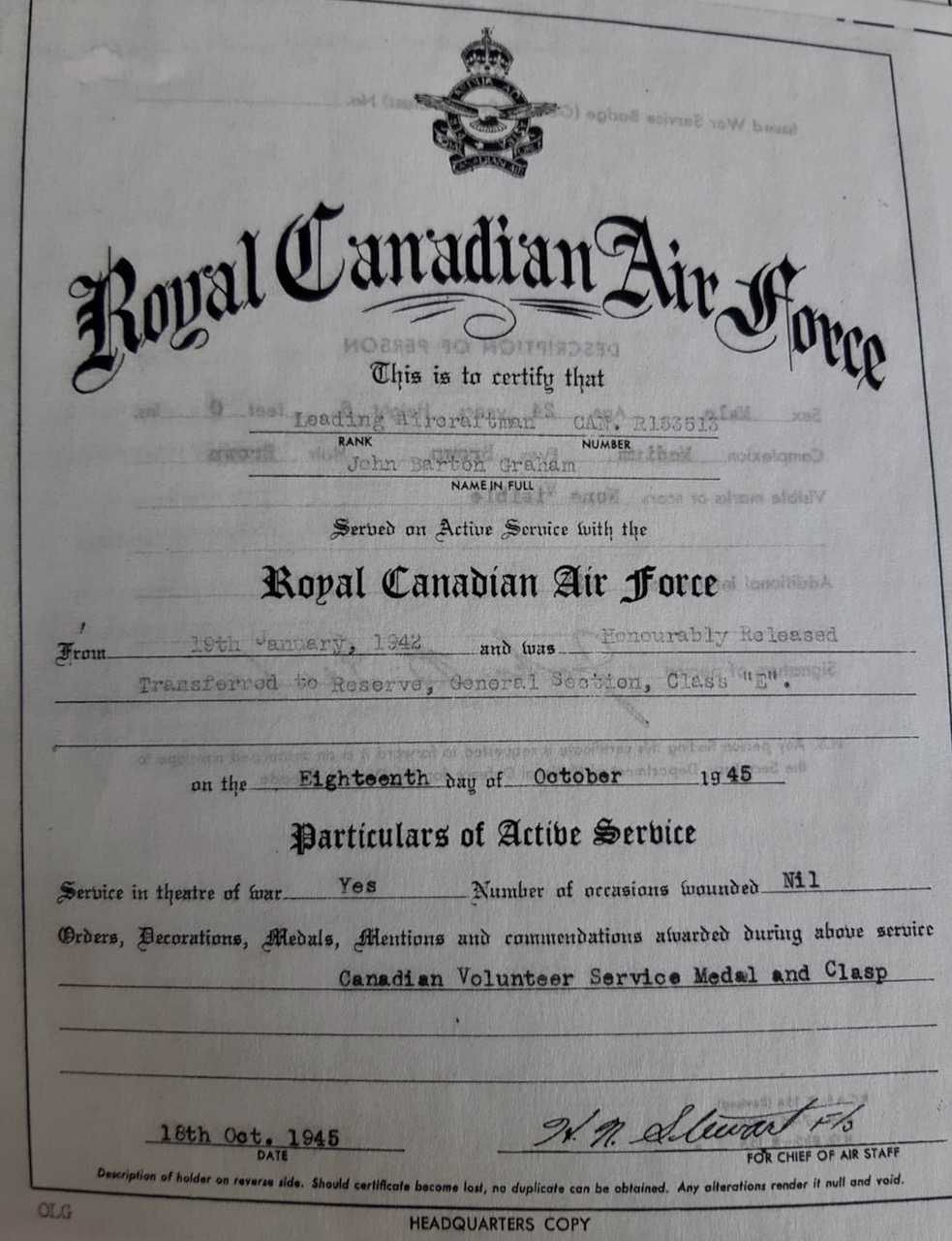 John Graham was born February 25, 1921 in Toronto. He grew up in a large family in the western end of Toronto’s downtown, attending the public schools and playing ball at Christie Pitts. John was able to graduate Grade 13 at Bloor Collegiate, after which time he went into the RCAF. Basic training followed, and in short order he was in Halifax, boarding a troop ship bound for Liverpool. Once in England, John was assigned to a squadron, where he took up his important support role as a driver and member of the ground crew, fueling planes and driving supplies and officers wherever they were needed. Down time was part of overseas service too, from time in the pub to a military baseball league. John spent three years overseas, and he returned to Canada anxious to resume his role as a civilian. He returned to his job at GE amd in short order was married and raising a family, finding his own path in the rhythms of postwar Canadian life. John Graham was interviewed by Scott Masters at his home in Brooklin in June 2022.
