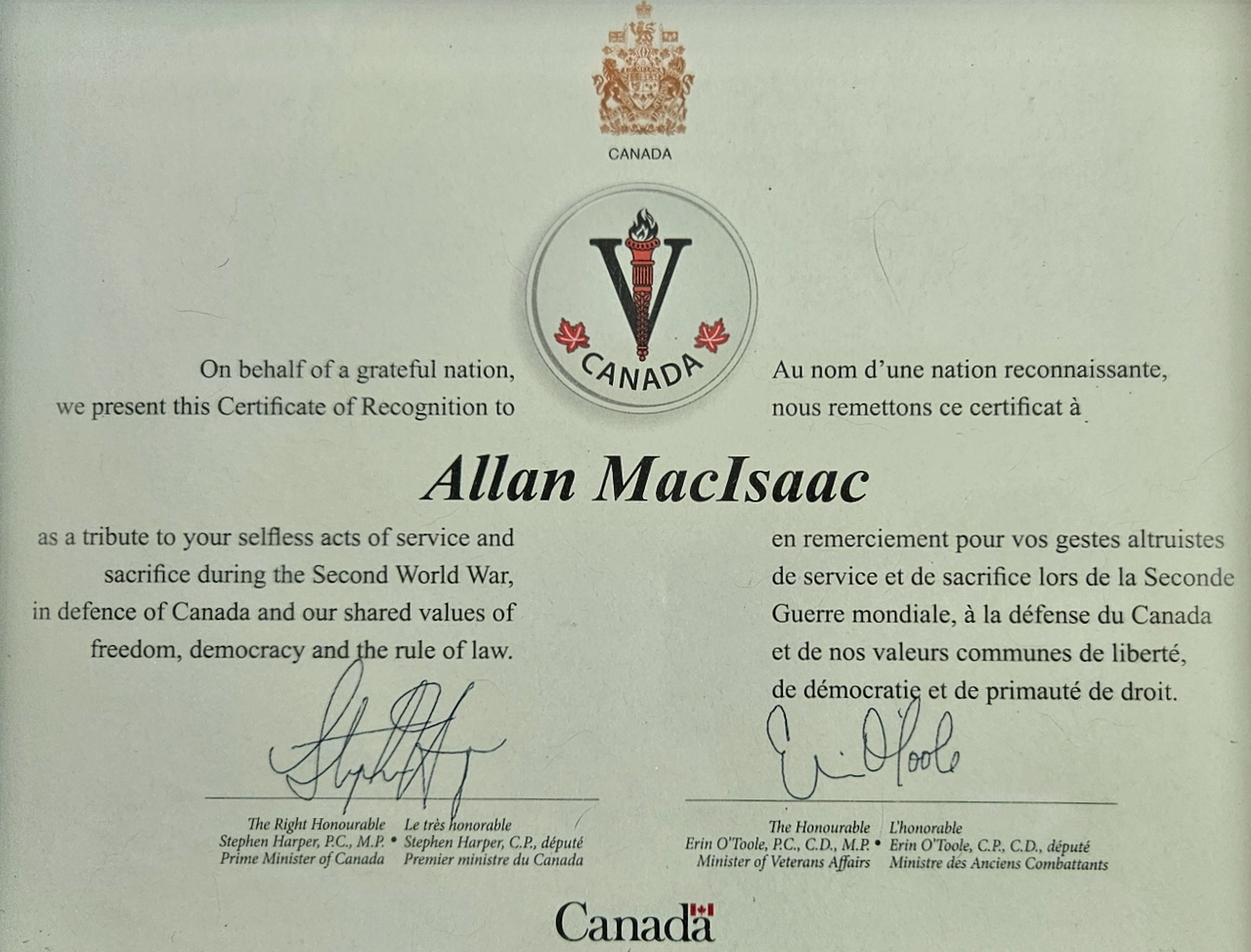 Allan MacIsaac was born March 22, 1927, in Inverness County, on Cape Breton Island, Nova Scotia. He grew up the son of a lobsterman/coal miner in a large family, where he was one of 12 children. He remembers his childhood in positive terms, working on the farm and swimming in the ocean. Allan’s father had been in the Royal Navy in the Great War, and one of his brothers served aboard the HMCS Prince Henry during World War Two. When Allan was 16 he visited his brother in Halifax during a school break, and while there he signed on to the merchant navy – his father came to try to get him out of it, but the ship had sailed by then. Allan completed a number of convoy crossings during the war, sailing out of Canada’s maritime ports to destinations in Europe and Africa, carrying the vital war supplies that kept the fight going. Along the way he confronted the danger of U-boats and rough seas, but he remembers it largely as a positive experience for a teenage boy. He also served on pilot ships in Halifax Harbour, and for a time he served on a cable ship, maintaining the trans-Atlantic cables that were critical to wartime communications. Allan MacIsaac was interviewed by Scott Masters and Zach Dunn at his home in Pickering, Ontario in March 2025.