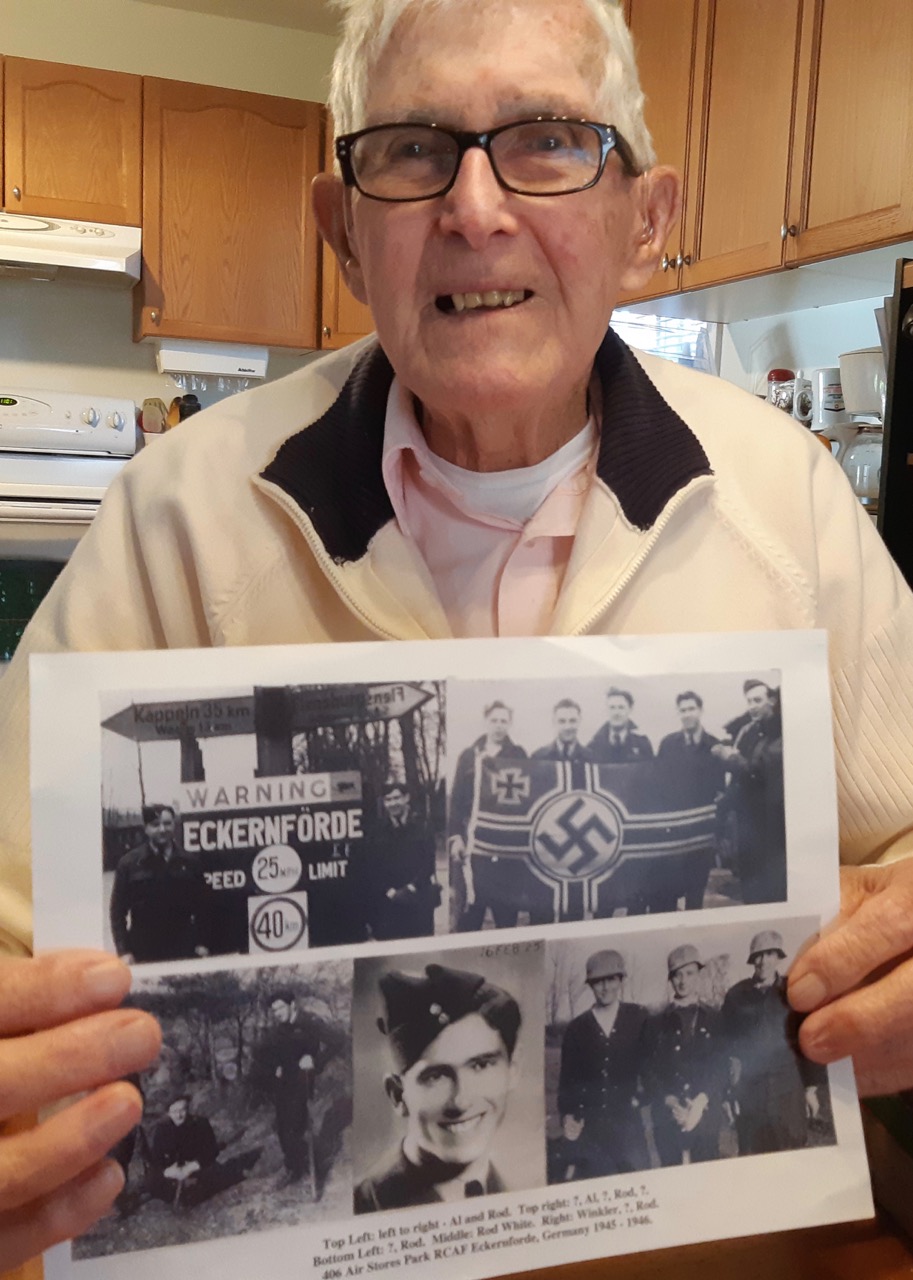 Rod White was born in Trenton, Ontario in 1925. Rod’s father died when he was only four, and some of his early memories are of his mother struggling to raise her seven children in difficult economic times. Rod was a sickly child, suffering from bouts of tuberculosis and jaundice; combined with wearing glasses from an early age, he remembers school not being easy, and he left after Grade 8, going to work and helping to support the family. Work took him out west, and in the early part of the war he worked in the Vancouver Shipyards, and his attempts to enlist were denied given his past health. As he recalls, he kept trying though, and eventually a doctor failed to recognize the Tb scars on his chest X-ray, and Rod found himself in the army. Rod opted for the RCAF and was sent for initial training as a mechanic. As he was quite skilled, he was quickly sent overseas, and began work on air bases in England. Rod worked mainly on Dakota and Mosquito aircraft, but he also had the difficult task of body recovery; the bases where he was stationed – Manston and Bradwell – were right on the Channel, and many bombers crash landed there. Rod also recounts his time in England off the base, from visits to London and a near hit by a V2 rocket to time in the very crowded pubs to the omnipresent NAAFI time – otherwise known as tea time. As the war concluded, Rod was redeployed to Germany, where he was part of the Army of Occupation. He spent a year there, returning to Canada via Halifax, ready to resume his life on the home front. Rod spent some time up north, and ultimately decided to join into the army reserve, and he ended up being stationed in Tanzania for a period of time, where bizarre encounters in Cold War Africa became the order of the day. Rod White was interviewed by Eric Brunt in early 2019, as part of Eric’s yearlong journey across Canada. Scott Masters visited Rod at his home in Belleville in October 2019, and Crestwood student Miranda Su edited that video as part of her Grade 12 OHP requirement.